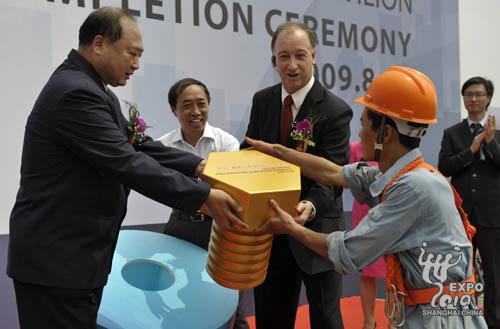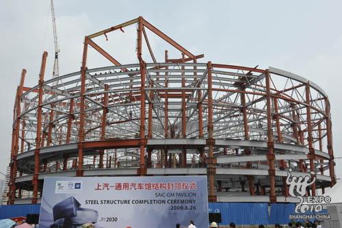 8月26日上午,2010年上海世博會(huì)上汽-通用汽車館鋼結(jié)構(gòu)正式封頂,標(biāo)志性的螺旋型建筑外觀雛形初現(xiàn)。上海世博局黨委副書(shū)記許偉國(guó)、上海汽車副總裁肖國(guó)普、通用汽車中國(guó)公司總裁兼總經(jīng)理甘文維等出席封頂儀式,共同見(jiàn)證最后一顆螺釘釘入鋼梁。