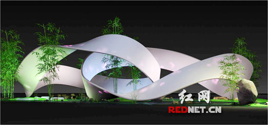 (三)彰顯湖湘文化,突出湖南元素。展館的設(shè)計(jì)形象湖南色彩濃厚,竹、紙、芙蓉花、桃花源、武陵源概念等湖南元素以及蔡倫造紙、隆平水稻、白石藝術(shù)、毛澤東故事等湖湘人文形象貫穿整個(gè)設(shè)計(jì)。環(huán)體主體材料為竹結(jié)構(gòu),且整個(gè)場(chǎng)館掩映于竹林碧水之間,竹使人聯(lián)想起湘妃竹、瀟湘竹海和毛主席的詩(shī)句。整個(gè)魔比思環(huán)就像展開(kāi)的卷軸,環(huán)體外表用紙裝飾,紙是中國(guó)古代四大發(fā)明之一,湘人蔡倫造紙,體現(xiàn)了湖南歷來(lái)有重視教育科技創(chuàng)新的傳統(tǒng)。芙蓉花代表湖南自然、綠色形象。還有懷素的草書(shū)、齊白石和黃永玉的畫(huà),體現(xiàn)出湖南人對(duì)自然的膜拜、對(duì)美的執(zhí)著追求。館名“桃花源里·Xanadu”更是顯現(xiàn)了桃花源的概念和世人對(duì)“世外桃源”的千年尋夢(mèng)。并用這些濃厚的湖南元素設(shè)計(jì)組合,烘托出毛澤東詩(shī)句中的“萬(wàn)類(lèi)霜天競(jìng)自由”、“桃花源里可耕田”、“芙蓉國(guó)里盡朝暉”的偉大浪漫主義情懷,把“都市桃花源”的理想境界推廣到全世界。