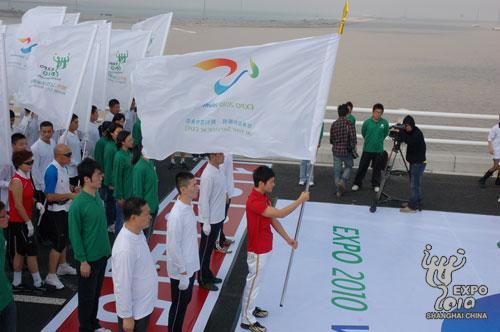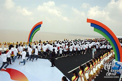 共青團(tuán)上海市委書(shū)記、上海市世博會(huì)籌備工作領(lǐng)導(dǎo)小組志愿者組副組長(zhǎng)潘敏為“大橋跑”發(fā)令起跑。起跑前,21名少女手捧取自沿長(zhǎng)江21個(gè)城市采集而來(lái)的母親河水水樣,匯入長(zhǎng)江入?,表達(dá)了志愿者的拳拳赤子之心,也表達(dá)了志愿者對(duì)上海世博會(huì)的美好祝愿。