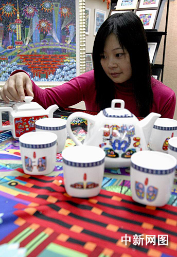 中新網(wǎng)11月24日電(萬軍)為迎接世博會到來,上海金山農(nóng)民畫院特地開發(fā)出系列世博題材創(chuàng)意延伸產(chǎn)品,其中A套以江南傳統(tǒng)繡花鞋為圖案、選用著名的唐山骨瓷為原料,名為“和諧”茶壺(喝與鞋的諧音),B套茶壺蓋則用世博會中國館圖案制成,一經(jīng)面世,即受到中外人士的關(guān)注。