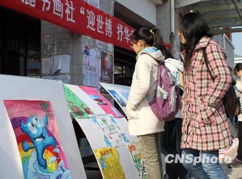 12月22日,安徽師范大學(xué)學(xué)生正在觀看“迎世博”書畫作品。當(dāng)日,安徽師范大學(xué)赭麓書畫社舉辦“迎世博 抒華章”書畫作品展覽活動,展出了86件由大學(xué)生自己創(chuàng)作的迎世博書法、繪畫作品,吸引了不少大學(xué)生的目光。隨著2010年上海世博會日益臨近,安徽師大學(xué)生舉辦了一系列活動來表達(dá)對世博會的期盼和祝福。中新社發(fā) 劉淮宇 攝
