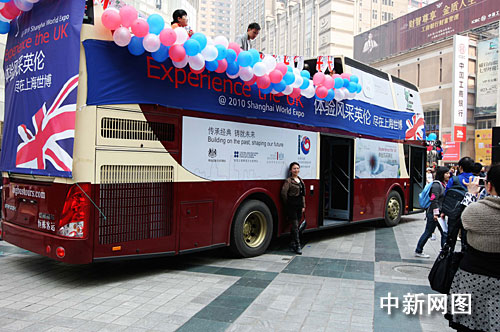 中新網(wǎng)重慶3月19日電(銀雪 郭晉嘉)19日,一輛英國傳統(tǒng)雙層大巴駛?cè)胫貞c最繁華的商貿(mào)中心解放街,宣傳上海世博會(huì)英國館及相關(guān)活動(dòng),呼吁重慶市民使用公共交通工具出行,倡導(dǎo)低碳活動(dòng)。