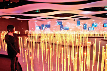 該館整體LED燈管約有11萬(wàn)米,能夠形成三維的顯示矩陣。從5月1日開(kāi)始,每天晚上閉館之前,將有這樣一個(gè)8分鐘左右的秀。經(jīng)歷一個(gè)“魔方”蘇醒的過(guò)程,觀眾會(huì)聽(tīng)到“魔方”的“心跳”,當(dāng)“讓我們蕩起雙槳”音樂(lè)片段配合著企業(yè)聯(lián)合館的三維畫(huà)面,過(guò)去的片段在腦海中浮現(xiàn)。