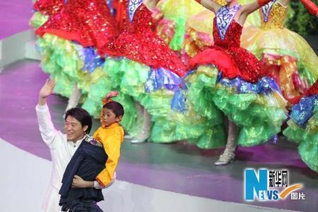 兩位來(lái)自青海玉樹地震災(zāi)區(qū)的藏族小朋友也在這時(shí)出現(xiàn)在了舞臺(tái)上。他們與三個(gè)三口之家走到一起,五個(gè)孩子手拉著手,深情地緊緊擁抱。舞臺(tái)上的演員們“心手相連”,表達(dá)了人類必須團(tuán)結(jié)一心相互支撐、攜手面對(duì)未來(lái)一切挑戰(zhàn)的寓意。