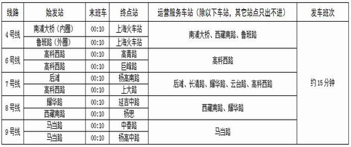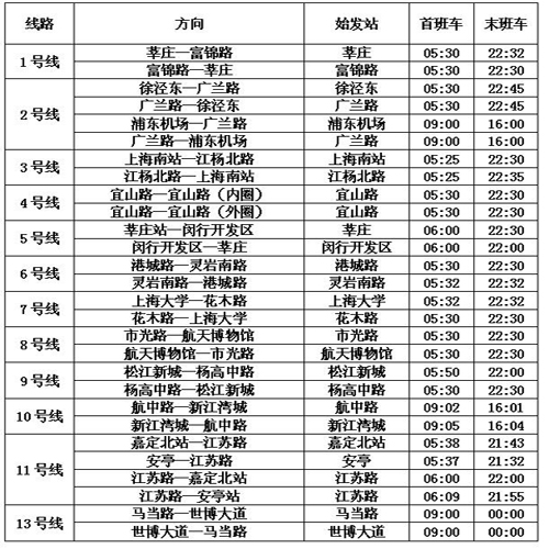 軌道交通4、6、7、8、9五條涉博線路在常規(guī)末班車后,將在世博園周邊站點(diǎn)加開加班列車,除重點(diǎn)涉博車站以外,其他途經(jīng)車站只可下客出站,不可進(jìn)站上客和換乘。加開列車末班車時(shí)間為0:10,運(yùn)營(yíng)間隔約為15分鐘一班。具體車站的首末班車時(shí)間還可查看各車站公告、至上海地鐵官網(wǎng)(/) 進(jìn)行查詢或撥打地鐵服務(wù)熱線64370000進(jìn)行詢問。