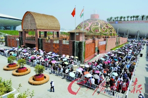 在英國館,10時剛過館前的隊伍已神龍見首不見尾。那隊伍從館前一直繞,繞到了邊上的小花園,繞過了旁邊的公廁!瓣犖榈哪┪苍谶@兒,排隊的人請盡量往外靠!惫ぷ魅藛T嚷著大嗓門不斷地叫喚,“進(jìn)園,至少3個小時吧。”她告訴記者。