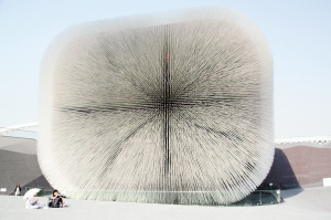 記者:我現(xiàn)在就在英國館外大概50米左右的地方,英國館占地6千平方米,是最大的自建館之一,在英國館的入口處外墻上印了這么一句話,“英國館就是英國送給中國的禮物”。為什么這么說呢,因為整座的英國館的外墻就像一個剛剛打開的精致禮品包裝盒,種子圣殿就是禮物本身,在外面的露天廣場則是剛剛取開的包裝紙,游客們可以在上面休息,孩子們可以在上面嬉戲。