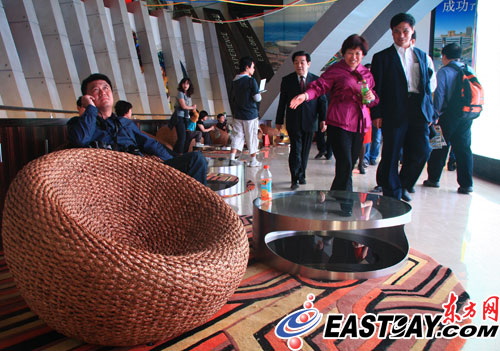 以“崛起的大國”為主題的南非館這次完全舍棄了野生動(dòng)物、美麗風(fēng)光等常態(tài)化展示,而是用一個(gè)球形的視頻墻占據(jù)在展館中央,四周圍放置著竹編的各式藤椅。負(fù)責(zé)籌建和部分設(shè)計(jì)的南非館的中方負(fù)責(zé)人黎先生告訴東方網(wǎng)記者,由于南非館將在世博會(huì)期間進(jìn)行五大主題的展示,“只有視頻能夠最好展現(xiàn)出來!