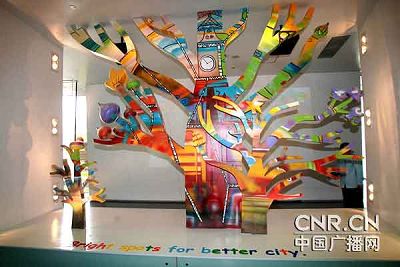 講解員說這些東西取材于俄羅斯全國兒童繪畫大賽的獲獎(jiǎng)作品,他們共同的主題是《我眼中的最佳城市》:一座座房子蓋在烏龜上,城市可以移動(dòng);有的樹上也蓋了房子,張開的樹枝就是一條條馬路。孩子們心中的未來城市真是充滿了想象力和童趣,這樣的設(shè)計(jì)也受到了正在參觀的孩子們的喜歡。