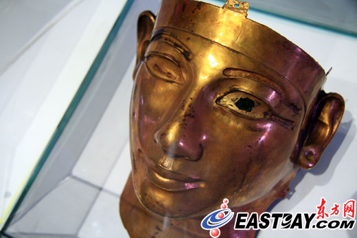 據(jù)介紹,“法老舍松契二世面具”誕生于公元前890年,在東尼羅河三角洲地帶被發(fā)現(xiàn)。黃金面具的左眼有一塊黑色,類似于眼珠,工作人員告訴東方網(wǎng)記者,可能是彩色涂料的殘留物,“這個(gè)面具的眼睛、眉毛等處在當(dāng)時(shí)應(yīng)該有被涂上彩色顏料。”