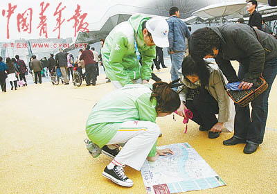 中國(guó)館南廣場(chǎng)上的30名首批志愿者都是來自復(fù)旦大學(xué)的學(xué)生。他們的工作在很多人看來很簡(jiǎn)單,就是疏導(dǎo)游客,給游客指路。他們每天要重復(fù)幾萬次的回答就是:“對(duì)不起,預(yù)約券已經(jīng)發(fā)完了”,“您好,請(qǐng)往這邊走”……“現(xiàn)在我已經(jīng)不用看地圖就能清楚地給游客指路了。以前還不熟悉的時(shí)候,我利用休息的時(shí)間不斷地看地圖,已經(jīng)翻爛了兩份地圖,這是第三份了!卞X琲從包里翻開她的園區(qū)地圖,這一份也已經(jīng)快被她翻爛了,快斷裂的地方她用透明膠布粘著。