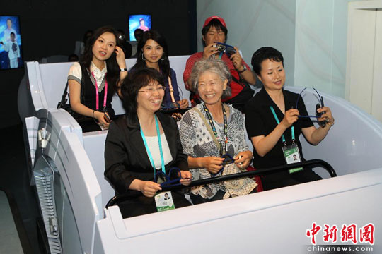 當“世博奶奶”乘坐的通往中國航空館二樓主展區(qū)的電梯門一打開,她便發(fā)出驚嘆之聲,隨即表示非常期待體驗中國航空館主展區(qū)的地乘4D展演系統(tǒng),當乘坐無軌觀光車體驗過一段完美的飛翔之旅后,“世博奶奶”意猶未盡地說:“非常棒,感覺像身臨其境一樣!