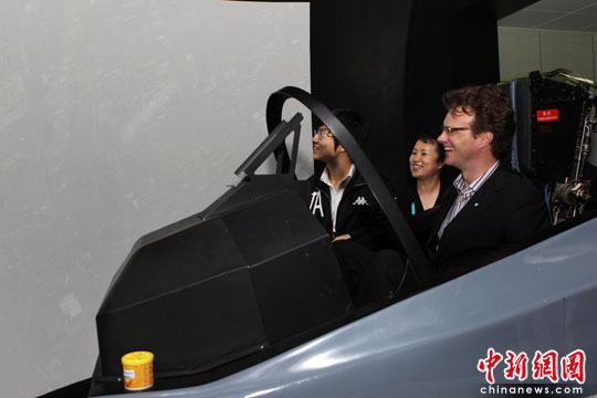 來到大型飛機模擬機展區(qū),大山嫻熟地坐進駕駛艙體驗飛行!澳鞘瞧謻|、這是陸家嘴!彼贿叢倏v模擬機,一邊辨認著大屏幕上出現(xiàn)的地面標志性建筑物。大山對環(huán)形屏幕中顯示的上海非常熟悉,認出了很多地點,并笑稱要從世博會加拿大館上空飛過。走下駕駛艙,大山幽默地稱自己有點快學會開飛機了。