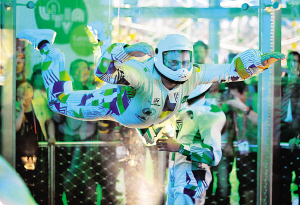 在展館樓上,有一個8米高的“玻璃房子”,一鼓風(fēng),玻璃房內(nèi)的人可以飛起來,風(fēng)洞的風(fēng)速可以在瞬間達到20公里/小時,穩(wěn)穩(wěn)托舉住“飛人”。在昨天開館儀式后,拉脫維亞總理東布羅夫斯基斯身穿“飛翔服”,戴上頭盔,親身體驗了一回當(dāng)空中飛人的感覺,將現(xiàn)場氣氛推向高潮。