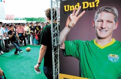 南非館前的籠式足球游戲成為園區(qū)最熱門的互動(dòng)項(xiàng)目之一。雖然獎(jiǎng)品只是世界杯紀(jì)念水壺,可球迷們都表示不是沖著獎(jiǎng)品去的,幾小時(shí)內(nèi)數(shù)百人在鐵籠中大秀腳法。期間,也有外國游客躍躍欲試。一名叫卡爾的德國男子看到足球就來勁,上前擺出的架勢頗為專業(yè),最后還是三次全部踢偏。
