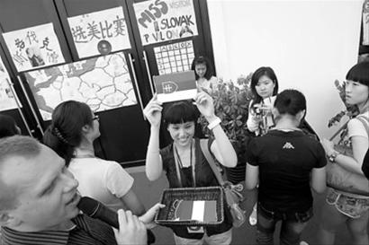 昨天下午2點(diǎn), 18名在斯洛伐克館等待入場(chǎng)的美女被邀請(qǐng)參加“女士之日”的選美大賽,比賽共分為兩個(gè)環(huán)節(jié),包括有關(guān)世博和斯洛伐克的問答,以及才藝表演。在決賽環(huán)節(jié),三位女士同時(shí)學(xué)唱一首斯洛伐克兒歌,現(xiàn)場(chǎng)的觀眾則成為決賽評(píng)委。最終,來自上海徐匯區(qū)的護(hù)士小姐沈瑾脫穎而出,獲得 “斯洛伐克館小姐”的榮譽(yù)稱號(hào),她的大幅照片還將被掛在斯洛伐克館的貴賓廳。除了來自斯洛伐克館的眾多禮遇,她還能選擇多個(gè)熱門場(chǎng)館,直接從VIP通道入內(nèi)參觀。