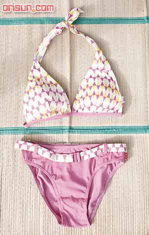 束帶的泳衣雖然性感,但相對地較易松脫,所以在打結(jié)時要分外小心,絕對不能太松,同時亦可打死結(jié),會更加保險。下身方面,可選擇配上一條松身短褲,而特別配合泳衣設(shè)計的配褲,顏色鮮艷,選用了魔術(shù)貼取代拉鏈的設(shè)計,穿 時會更加方便。
