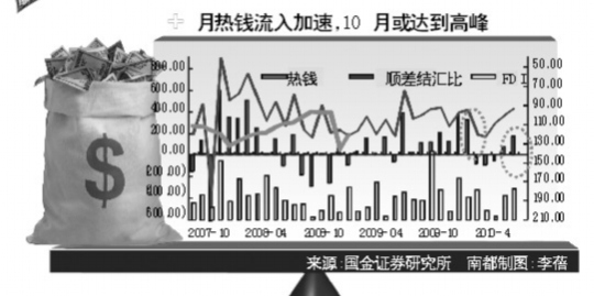 對(duì)熱錢推動(dòng)的流動(dòng)性充沛可以持續(xù)多久的問題,國(guó)金證券分析認(rèn)為,“全球流動(dòng)性充沛正成為中期問題。地產(chǎn)調(diào)控、升值預(yù)期的明確以及美元趨勢(shì)、熱錢的監(jiān)管加強(qiáng)使得熱錢流入速度在10月達(dá)到高峰后趨于緩和!眹(guó)內(nèi)的熱錢流入成為短期內(nèi)無法拒之門外的中期問題。預(yù)計(jì)11月份熱錢流入的增長(zhǎng)速度將轉(zhuǎn)緩,但是流動(dòng)性數(shù)量的轉(zhuǎn)折至少要到2011年2季度才能看到。
