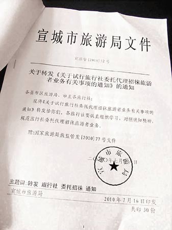記者向當(dāng)?shù)芈糜螛I(yè)界人士了解了一些情況,據(jù)說(shuō)整個(gè)宣城市,包括涇縣在內(nèi),沒(méi)有一家旅行社具備組織出境游的資格。當(dāng)?shù)芈眯猩缱疃酁楹戏、南京等地旅行社做代理攬客的業(yè)務(wù)。