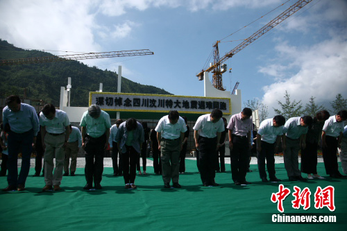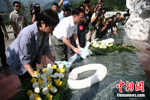 隨后,曾蔭權(quán)一行來到漩口中學地震遺址。烈日下,曾蔭權(quán)肅立默哀,向汶川大地震遇難者和在抗震救災中英勇犧牲的烈士三鞠躬,獻花祭奠。