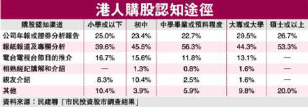 不過,即使在表示會初步了解公司資料者中,也有48.8%主要是透過“報紙報道及專欄分析”作為資料來源,13.1%則根據(jù)“電臺及電視節(jié)目推介”,只有24.7%的主要資料來源是“公司年報或證券行分析報告”。