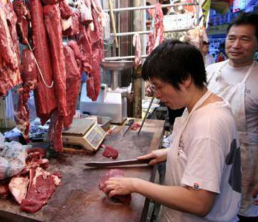 “資料圖:2007年8月23日”香港五豐行決定再調(diào)高活牛批發(fā)價(jià)后,2007年8月23日,有街市肉檔將零售價(jià)調(diào)高10%,但來貨量仍然緊張。據(jù)鮮肉大聯(lián)盟主席文灼培當(dāng)日表示,五豐行只有38只內(nèi)地活牛到港。 中新社發(fā) 譚達(dá)明 攝