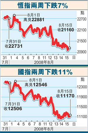港股上周下跌725點(diǎn),跌幅3.3%。大福資料研究高級(jí)經(jīng)理曹福達(dá)表示,港股正處于熊市二期,走勢(shì)相當(dāng)反復(fù),但相信在奧運(yùn)后,股市有較顯著的反彈,而交投也將會(huì)再度活躍,令后市走勢(shì)明朗化。