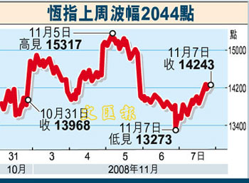 葉尚志估計(jì),港股在10676點(diǎn)見底后的第一波反彈,已在周三完成,當(dāng)日恒指曾見過15318點(diǎn),后市料進(jìn)入反復(fù)整固階段,上下范圍在12500至15000點(diǎn)間,未來焦點(diǎn)則會(huì)放在將公布的內(nèi)地CPI和PPI數(shù)據(jù),以及本月15日舉行的G20首腦會(huì)議。