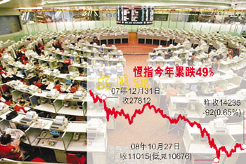 恒指30日收報14235點,今年以來計,跌幅達49%或13600點,以點數(shù)計是歷年最大,以百分比計是歷年第二大。受環(huán)球金融海嘯拖累,年內(nèi)市況極為動蕩,連強積金也大虧,無論大戶散戶,也不論有否投資股票,人人損失慘重。