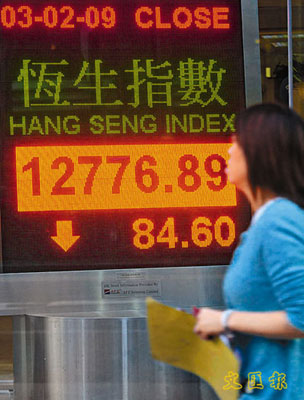 中新網(wǎng)2月4日電 據(jù)香港《文匯報》報道,港股3日再一次由升轉(zhuǎn)跌,早高開130點后,在高位反復(fù)徘徊,最高曾見13065點,但午市后升幅開始收窄,最多跌逾130點,全日收報12776.8點,跌84.6點,成交額進一步縮減至353.16億元。