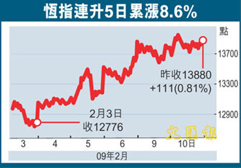 中新網(wǎng)2月11日電 據(jù)香港《文匯報(bào)》報(bào)道,港股連升5天,合計(jì)共升約1100點(diǎn),恒指10日收?qǐng)?bào)13880點(diǎn),升111點(diǎn),成交421億。內(nèi)地傳出振興石化行業(yè)計(jì)劃,包括提高暴利稅起征點(diǎn),石油股上升,加上內(nèi)地股市升勢(shì)強(qiáng)勁,有證券界人士認(rèn)為市場(chǎng)在觀望美國(guó)通過(guò)救市方案后,恒指短期內(nèi)有機(jī)會(huì)上試14000點(diǎn)。