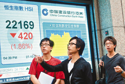 中新網10月28日電 據香港《文匯報》報道,外圍股市跌,拖累港股在臨近期指結算前急挫,恒指27日隨美股疲軟而低開573點,其后跌幅一度收窄至不足400點,但午后內地股市“插水”,大跌近3%,恒指下午再一輪下跌,結果全日跌420點,收報22169.5點,跌1.86%,是三周以來最大跌幅,港股成交額739億元。