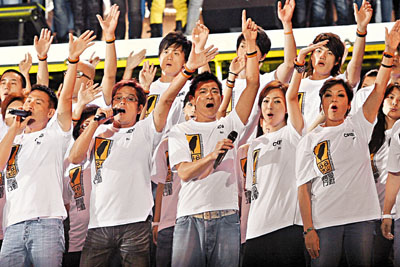 沒人歡呼,沒人揮動熒光棒,萬人聚集在一起,并不是欣賞精彩表演,為的只是告訴臺灣受臺風(fēng)吹襲的災(zāi)民,他們在困境中并不孤獨(dú);為的只是從心中呼喊一聲:“臺灣加油!”