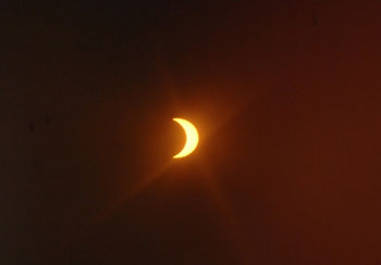 在香港,初虧在早上約8時15分開始,太陽的右上方開始出現(xiàn)陰影,其后逐漸進入日面,到大約9時,一半的太陽已經(jīng)被陰影遮蓋,透過濾光鏡觀看,太陽出現(xiàn)缺口,形狀如月牙。