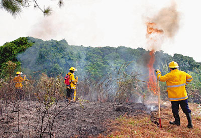 中新網(wǎng)10月27日電 據(jù)香港《文匯報》報道,不少香港市民趁26日重陽節(jié)到各區(qū)墳場掃墓,適逢天文臺發(fā)出黃色火災(zāi)危險警告,以致山火頻發(fā)。消防處26日接獲32宗山火報告,雖無人受傷,但消防員疲于奔命,帶備火拍及背泵上山撲火。由于山火眾多,港府飛行服務(wù)隊直升機(jī)也頻頻出動,空投水彈協(xié)助救火。