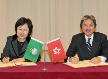 24日,香港財政司司長曾俊華及澳門政法務司司長陳麗敏在香港簽署了《中華人民共和國香港特別行政區(qū)政府與中華人民共和國澳門特別行政區(qū)政府關于持永久性居民身份證入出境及互免填報入出境申報表協(xié)議》。這標志港澳兩地在出入境事務方面的合作進入新的階段。