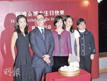 四太大女何超盈手持寫上“Happy Birthday 掂呀!”的巨型生日卡賀老父,四太則用手做出心形手勢表示送個(gè)心給賭王。二太藍(lán)瓊纓則率領(lǐng)三女一子何超瓊、何超鳳、何超蕸及何猷龍出席“賀禮捐公益”活動(dòng),代表賭王將一張150萬元的支票捐贈(zèng)公益金,并透露賭王進(jìn)展良好,但仍未可出院,要在醫(yī)院度生辰。