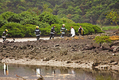消防員趕至,帶備木板和鐵鏟往救人,步出10多米后已身陷泥灘,10多名消防員遂改以匍匐前進(jìn)方式靠近,花約1小時(shí)終掘開(kāi)兩名事主身邊瘀泥,將他們救出帶回路邊。兩名事主無(wú)受傷,但與消防員一樣滿(mǎn)身泥濘,要出動(dòng)消防喉沖洗身體,及后自行離開(kāi)。