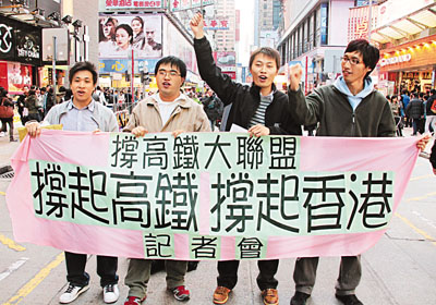 社交網(wǎng)站近日有人組成“撐起高鐵,撐起香港”群組,并已有逾萬名支持者。一群生于上世紀(jì)70及80年代的人士更組成“撐高鐵大聯(lián)盟”,上周成立“集會支持西九起高鐵”群組,目前已有逾1100名支持者。4名聯(lián)盟成員13日在旺角街頭,呼吁其他高鐵支持者本周五往立法會門外靜坐,以示“撐高鐵”的決心。