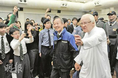 身穿藍(lán)色外套、系上母校領(lǐng)帶的高錕,7日出席母校圣若瑟書院成立135周年開放日開幕典禮。精神飽滿的高錕在全場熱烈掌聲下,由校監(jiān)湯瑪士修士陪同進(jìn)入禮堂,太太黃美蕓則拉著高錕的外套,緊隨其后進(jìn)場。