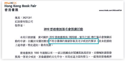 據(jù)香港明報(bào)報(bào)道,書展今屆共收到約130多宗簽名活動(dòng)申請(qǐng)。貿(mào)發(fā)局傳媒及公關(guān)部發(fā)言人張志輝表示,“香港書展文化活動(dòng)顧問團(tuán)”大半年前已成立,成員來自文化、出版、教育和傳媒界共13人,昨經(jīng)過早上開會(huì)后,決定拒絕不超過10宗簽名會(huì)申請(qǐng)。