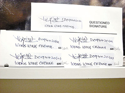 Robert Radley首先集中分析王永祥的英文簽名“Winfield Wong”。他表示,“06年遺囑”簽名中“Winfield”的“f”就有3個(gè)不同之處。在王永祥的簽名樣本中,“f”都是由下而上寫,故收筆位置是朝文件左上方,“f”下半部分較彎;但“06遺囑”中“f”卻似是由上而下寫,由于筆順有誤,原來的收筆位置,變成起筆位置,而且是朝右上方,“f”下半部分也較筆直。他指出,“f”上半部分有一個(gè)“圓圈”,在“06遺囑”的簽名中“圓圈”位置是朝上,與其它樣本相反。