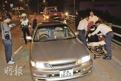 潘見狀大驚,慌亂間立刻倒車欲突圍,不料車尾撞向一輛尾隨的士,頓被困于路中,兩惡煞此時追上,再用鐵錘痛擊其頭部后,搶走車內(nèi)一個裝有現(xiàn)金的手袋,然后登上七人車往香港仔隧道方向絕塵而去。