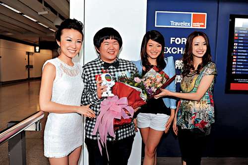 中新網(wǎng)5月6日電 憑《I Will Always Love You》一曲在國際爆紅,有“臺版蘇珊大嬸”之稱的小胖林育群,5日由臺灣來港展開五天宣傳之旅,無線特地派出應(yīng)屆三位港姐劉倩婷、熊穎詩及李姿敏到機場獻花給他,令小胖高興得一直在冒汗。對于外形備受批評,但小胖坦言發(fā)型、肚腩及領(lǐng)結(jié)都是他的標志,所以無意減肥或整容,倒希望眼睛可以大一點,因眼睛小戴隱形眼鏡有難度。