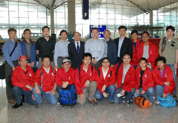 食物環(huán)境衛(wèi)生署署長(zhǎng)卓永興、水務(wù)署署長(zhǎng)馬利德及署理衛(wèi)生署衛(wèi)生防護(hù)中心總監(jiān)梁挺雄醫(yī)生,19日早在隊(duì)伍出發(fā)前吁請(qǐng)他們把香港市民的關(guān)懷和問候帶給受地震影響的災(zāi)民。他們又向救援隊(duì)的無私奉獻(xiàn)表示謝意,并鼓勵(lì)他們?cè)谛袆?dòng)中竭盡所能。