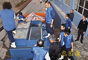 根據(jù)初步檢查結(jié)果,兩尾鱘魚不僅體內(nèi)有炎癥,體外也有不少擦掛傷口。專家會診后制定了“針療+藥物潑灑+水質(zhì)調(diào)整”三路并進的治療方案,一方面按照每周兩次的頻率為鱘魚注射抗生素等針劑,同時每周向繁育池中潑灑2至3次調(diào)配好的粉狀藥物,主要功效都是消炎;刈顬榫o張的水質(zhì)檢測,則指派專人負責(zé)每日抽樣送檢。
