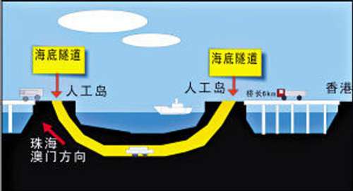 據(jù)大橋工程可行性研究總報(bào)告顯示,大橋主體工程長約35公里,擬定采用橋隧結(jié)合方案,其中位于伶仃西航道和銅鼓航道之間的海底隧道長6.75公里,隧道與橋梁相接處各修兩個(gè)橫截面長1公里的人工島;隧道造價(jià)約211億元人民幣,占到大橋主體工程預(yù)算投資額的近一半,其最深處離海平面40米左右,將確保30萬噸級油輪和15萬噸級以上集裝箱順利通航。