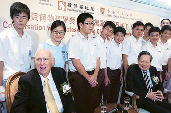 香港中大及新鴻基地產(chǎn)昨日第八度舉辦“新鴻基地產(chǎn)諾貝爾獎(jiǎng)得獎(jiǎng)學(xué)人杰出講座系列”,今年邀請(qǐng)兩名諾貝爾物理學(xué)獎(jiǎng)得主楊振寧和馬丁•佩爾出席講座,與百多名學(xué)生真情對(duì)話。有學(xué)生提到香港與美國(guó)學(xué)生的分別時(shí),楊振寧指美國(guó)與香港的教學(xué)哲學(xué)距離甚大,香港學(xué)生由小學(xué)、中學(xué)開(kāi)始便會(huì)操練數(shù)學(xué),數(shù)學(xué)較理想。他又推薦年輕人閱讀《雙螺旋》,故事講述一名年輕人努力不懈,最后成功發(fā)表“雙螺旋”理論,獲得諾貝爾生物獎(jiǎng)。