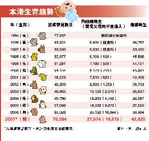 據香港明報報道,2007年醫(yī)管局共錄得39,182名新生嬰數字,醫(yī)管局總行政經理鄭信恩說,雖然傳統(tǒng)上生仔旺季一向在9月至11月,但今年首個半月公立醫(yī)院生產個案,已明顯較去年同期上升,“去年經濟好,市民積極想生育多點,估計今年生育也會多,新生嬰應會超過去年。”