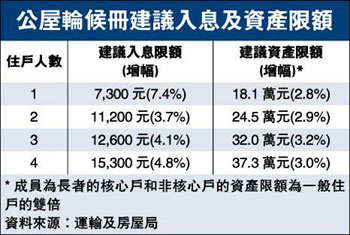 加上參考非住屋開支增幅后,房署建議提高輪候冊入息及資產(chǎn)限額,平均增幅5.5%及3.1%。單身人士入息限額由現(xiàn)在月入6800元,建議調(diào)升為7300元,增幅達(dá)7.4%,資產(chǎn)限額建議由現(xiàn)在17.6萬元,調(diào)升為18.1萬元。4人家庭入息限額就建議增為15300元,增幅4.8%,資產(chǎn)限額建議加至37.3萬元。